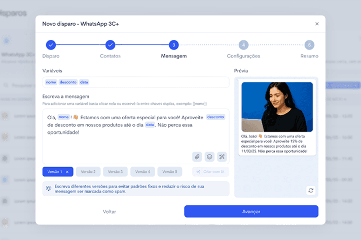 O produto precisava oferecer aos clientes uma forma de realizar envios em massa (SMS, WhatsApp não oficial, WhatsApp API Oficial e URA CPC). A complexidade estava em tornar a experiência simples e consistente, já que cada tipo de disparo tinha particularidades.
