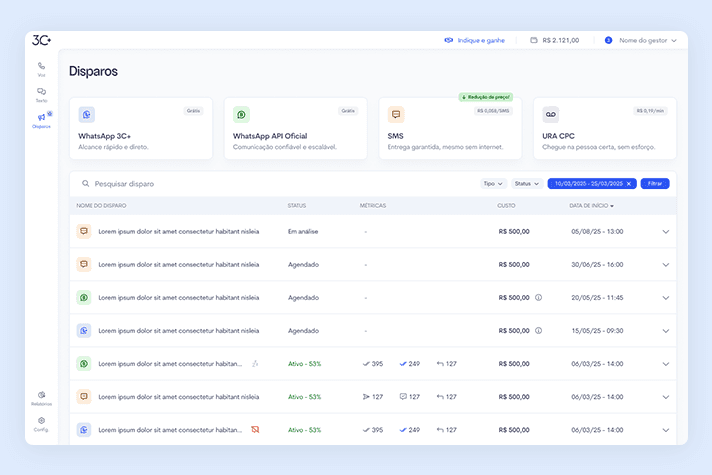 Uma única dashboard para acompanhar os resultados de todos os disparos em massa, sem precisar alternar telas.