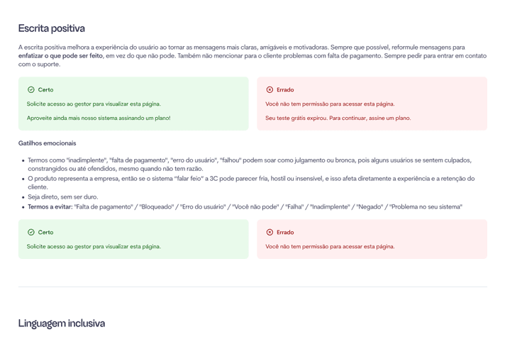Identifiquei a necessidade e, de forma proativa, desenvolvi um Manual de Tom e Voz para o produto, garantindo consistência de linguagem e clareza nas interações.