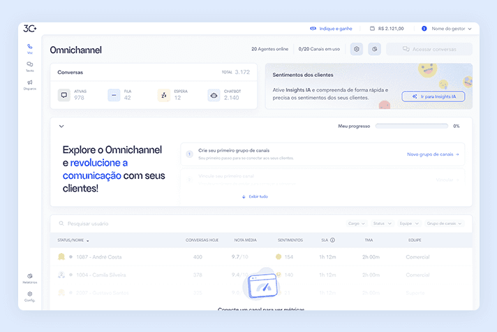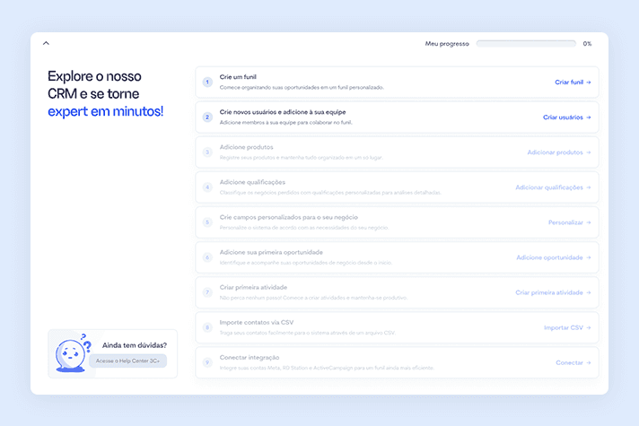 Fluxo guiado para configuração inicial de usuários, equipes, funis e canais.