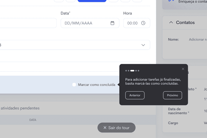 O tour reduziu significativamente o atrito no primeiro login, permitindo que novos clientes configurassem o essencial do CRM e do Omnichannel de forma autônoma e rápida. Isso aumentou a confiança no produto logo no início da jornada, além de reduzir a dependência do suporte.